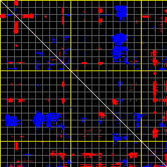 This matrix displays the maximum distance fluctuations between all pairs of CA atoms and between the two extreme conformations that were computed for this mode (DQMIN/DQMAX). Distance increases are plotted in blue and decreases in red for the strongest 10% of the residue pair distance changes. Every pixel corresponds to a single residue. Grey lines are drawn every 10 residues, yellow lines every 100 residues (counting from the upper left corner).