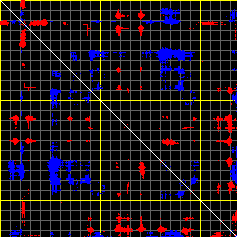This matrix displays the maximum distance fluctuations between all pairs of CA atoms and between the two extreme conformations that were computed for this mode (DQMIN/DQMAX). Distance increases are plotted in blue and decreases in red for the strongest 10% of the residue pair distance changes. Every pixel corresponds to a single residue. Grey lines are drawn every 10 residues, yellow lines every 100 residues (counting from the upper left corner).