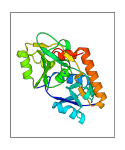 These views are prepared from three orthologuous viewpoints with MolScript. Secondary structures are determined from the C-alpha atom positions of your protein (N-terminal blue, C-terminal red).