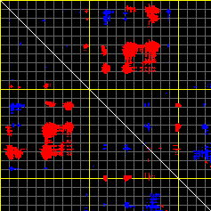 This matrix displays the maximum distance fluctuations between all pairs of CA atoms and between the two extreme conformations that were computed for this mode (DQMIN/DQMAX). Distance increases are plotted in blue and decreases in red for the strongest 10% of the residue pair distance changes. Every pixel corresponds to a single residue. Grey lines are drawn every 10 residues, yellow lines every 100 residues (counting from the upper left corner).