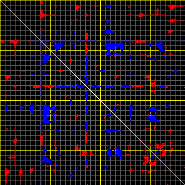 This matrix displays the maximum distance fluctuations between all pairs of CA atoms and between the two extreme conformations that were computed for this mode (DQMIN/DQMAX). Distance increases are plotted in blue and decreases in red for the strongest 10% of the residue pair distance changes. Every pixel corresponds to a single residue. Grey lines are drawn every 10 residues, yellow lines every 100 residues (counting from the upper left corner).