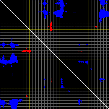 This matrix displays the maximum distance fluctuations between all pairs of CA atoms and between the two extreme conformations that were computed for this mode (DQMIN/DQMAX). Distance increases are plotted in blue and decreases in red for the strongest 10% of the residue pair distance changes. Every pixel corresponds to a single residue. Grey lines are drawn every 10 residues, yellow lines every 100 residues (counting from the upper left corner).