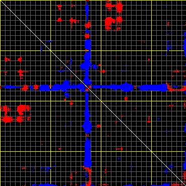 This matrix displays the maximum distance fluctuations between all pairs of CA atoms and between the two extreme conformations that were computed for this mode (DQMIN/DQMAX). Distance increases are plotted in blue and decreases in red for the strongest 10% of the residue pair distance changes. Every pixel corresponds to a single residue. Grey lines are drawn every 10 residues, yellow lines every 100 residues (counting from the upper left corner).