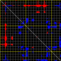 This matrix displays the maximum distance fluctuations between all pairs of CA atoms and between the two extreme conformations that were computed for this mode (DQMIN/DQMAX). Distance increases are plotted in blue and decreases in red for the strongest 10% of the residue pair distance changes. Every pixel corresponds to a single residue. Grey lines are drawn every 10 residues, yellow lines every 100 residues (counting from the upper left corner).