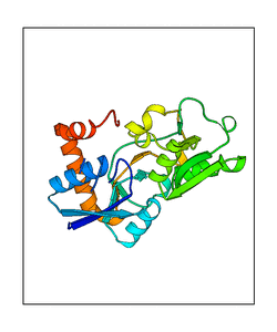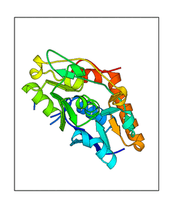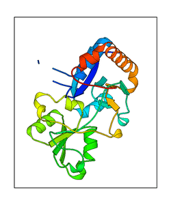 These views are prepared from three orthologuous viewpoints with MolScript. Secondary structures are determined from the C-alpha atom positions of your protein (N-terminal blue, C-terminal red).