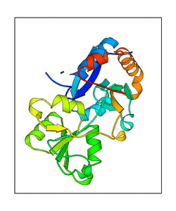 These views are prepared from three orthologuous viewpoints with MolScript. Secondary structures are determined from the C-alpha atom positions of your protein (N-terminal blue, C-terminal red).