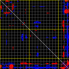 This matrix displays the maximum distance fluctuations between all pairs of CA atoms and between the two extreme conformations that were computed for this mode (DQMIN/DQMAX). Distance increases are plotted in blue and decreases in red for the strongest 10% of the residue pair distance changes. Every pixel corresponds to a single residue. Grey lines are drawn every 10 residues, yellow lines every 100 residues (counting from the upper left corner).