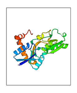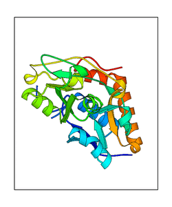 These views are prepared from three orthologuous viewpoints with MolScript. Secondary structures are determined from the C-alpha atom positions of your protein (N-terminal blue, C-terminal red).