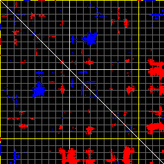 This matrix displays the maximum distance fluctuations between all pairs of CA atoms and between the two extreme conformations that were computed for this mode (DQMIN/DQMAX). Distance increases are plotted in blue and decreases in red for the strongest 10% of the residue pair distance changes. Every pixel corresponds to a single residue. Grey lines are drawn every 10 residues, yellow lines every 100 residues (counting from the upper left corner).