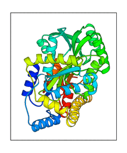 These views are prepared from three orthologuous viewpoints with MolScript. Secondary structures are determined from the C-alpha atom positions of your protein (N-terminal blue, C-terminal red).