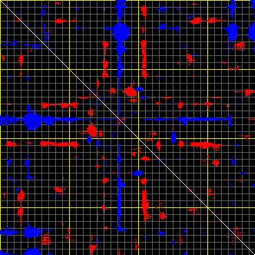 This matrix displays the maximum distance fluctuations between all pairs of CA atoms and between the two extreme conformations that were computed for this mode (DQMIN/DQMAX). Distance increases are plotted in blue and decreases in red for the strongest 10% of the residue pair distance changes. Every pixel corresponds to a single residue. Grey lines are drawn every 10 residues, yellow lines every 100 residues (counting from the upper left corner).