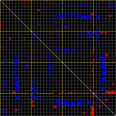 This matrix displays the maximum distance fluctuations between all pairs of CA atoms and between the two extreme conformations that were computed for this mode (DQMIN/DQMAX). Distance increases are plotted in blue and decreases in red for the strongest 10% of the residue pair distance changes. Every pixel corresponds to a single residue. Grey lines are drawn every 10 residues, yellow lines every 100 residues (counting from the upper left corner).