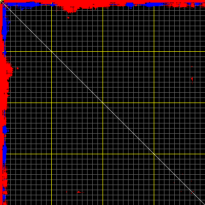 This matrix displays the maximum distance fluctuations between all pairs of CA atoms and between the two extreme conformations that were computed for this mode (DQMIN/DQMAX). Distance increases are plotted in blue and decreases in red for the strongest 10% of the residue pair distance changes. Every pixel corresponds to a single residue. Grey lines are drawn every 10 residues, yellow lines every 100 residues (counting from the upper left corner).