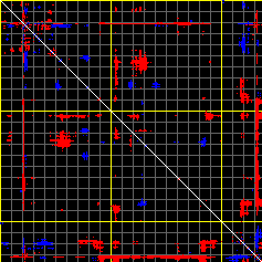 This matrix displays the maximum distance fluctuations between all pairs of CA atoms and between the two extreme conformations that were computed for this mode (DQMIN/DQMAX). Distance increases are plotted in blue and decreases in red for the strongest 10% of the residue pair distance changes. Every pixel corresponds to a single residue. Grey lines are drawn every 10 residues, yellow lines every 100 residues (counting from the upper left corner).