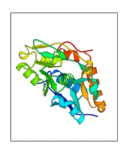 These views are prepared from three orthologuous viewpoints with MolScript. Secondary structures are determined from the C-alpha atom positions of your protein (N-terminal blue, C-terminal red).