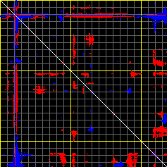This matrix displays the maximum distance fluctuations between all pairs of CA atoms and between the two extreme conformations that were computed for this mode (DQMIN/DQMAX). Distance increases are plotted in blue and decreases in red for the strongest 10% of the residue pair distance changes. Every pixel corresponds to a single residue. Grey lines are drawn every 10 residues, yellow lines every 100 residues (counting from the upper left corner).