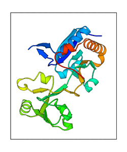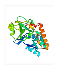 These views are prepared from three orthologuous viewpoints with MolScript. Secondary structures are determined from the C-alpha atom positions of your protein (N-terminal blue, C-terminal red).