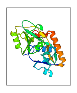These views are prepared from three orthologuous viewpoints with MolScript. Secondary structures are determined from the C-alpha atom positions of your protein (N-terminal blue, C-terminal red).