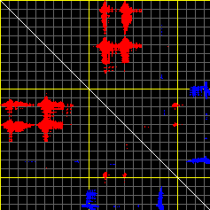 This matrix displays the maximum distance fluctuations between all pairs of CA atoms and between the two extreme conformations that were computed for this mode (DQMIN/DQMAX). Distance increases are plotted in blue and decreases in red for the strongest 10% of the residue pair distance changes. Every pixel corresponds to a single residue. Grey lines are drawn every 10 residues, yellow lines every 100 residues (counting from the upper left corner).