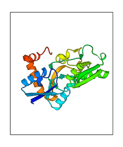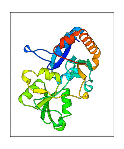 These views are prepared from three orthologuous viewpoints with MolScript. Secondary structures are determined from the C-alpha atom positions of your protein (N-terminal blue, C-terminal red).