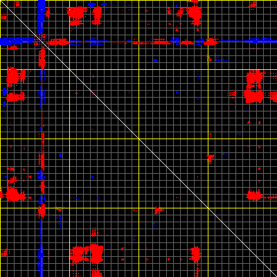 This matrix displays the maximum distance fluctuations between all pairs of CA atoms and between the two extreme conformations that were computed for this mode (DQMIN/DQMAX). Distance increases are plotted in blue and decreases in red for the strongest 10% of the residue pair distance changes. Every pixel corresponds to a single residue. Grey lines are drawn every 10 residues, yellow lines every 100 residues (counting from the upper left corner).