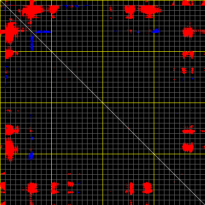 This matrix displays the maximum distance fluctuations between all pairs of CA atoms and between the two extreme conformations that were computed for this mode (DQMIN/DQMAX). Distance increases are plotted in blue and decreases in red for the strongest 10% of the residue pair distance changes. Every pixel corresponds to a single residue. Grey lines are drawn every 10 residues, yellow lines every 100 residues (counting from the upper left corner).