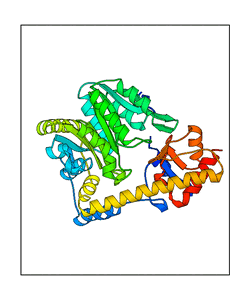 These views are prepared from three orthologuous viewpoints with MolScript. Secondary structures are determined from the C-alpha atom positions of your protein (N-terminal blue, C-terminal red).