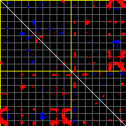 This matrix displays the maximum distance fluctuations between all pairs of CA atoms and between the two extreme conformations that were computed for this mode (DQMIN/DQMAX). Distance increases are plotted in blue and decreases in red for the strongest 10% of the residue pair distance changes. Every pixel corresponds to a single residue. Grey lines are drawn every 10 residues, yellow lines every 100 residues (counting from the upper left corner).