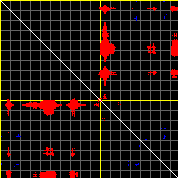 This matrix displays the maximum distance fluctuations between all pairs of CA atoms and between the two extreme conformations that were computed for this mode (DQMIN/DQMAX). Distance increases are plotted in blue and decreases in red for the strongest 10% of the residue pair distance changes. Every pixel corresponds to a single residue. Grey lines are drawn every 10 residues, yellow lines every 100 residues (counting from the upper left corner).