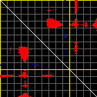 This matrix displays the maximum distance fluctuations between all pairs of CA atoms and between the two extreme conformations that were computed for this mode (DQMIN/DQMAX). Distance increases are plotted in blue and decreases in red for the strongest 10% of the residue pair distance changes. Every pixel corresponds to a single residue. Grey lines are drawn every 10 residues, yellow lines every 100 residues (counting from the upper left corner).