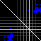 This matrix displays the maximum distance fluctuations between all pairs of CA atoms and between the two extreme conformations that were computed for this mode (DQMIN/DQMAX). Distance increases are plotted in blue and decreases in red for the strongest 10% of the residue pair distance changes. Every pixel corresponds to a single residue. Grey lines are drawn every 10 residues, yellow lines every 100 residues (counting from the upper left corner).