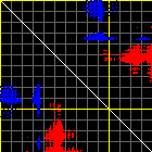This matrix displays the maximum distance fluctuations between all pairs of CA atoms and between the two extreme conformations that were computed for this mode (DQMIN/DQMAX). Distance increases are plotted in blue and decreases in red for the strongest 10% of the residue pair distance changes. Every pixel corresponds to a single residue. Grey lines are drawn every 10 residues, yellow lines every 100 residues (counting from the upper left corner).