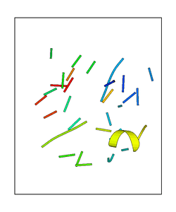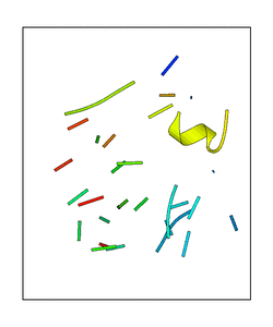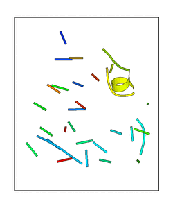 CAUTION: The amplitude range presented in these views corresponds to the highest (DQMAX) and lowest (DQMIN) perturbations chosen for this mode. Secondary structures can break down (and thus disappear from the animation) if the applied amplitudes are too large for Molscript to identify them. The choice of the amplitude is not a NMA result, but has to be done by the user on physical grounds. To change the amplitude range, you can recompute the animation of the desired mode by using the "Compute additional perturbed models with elNémo" section on the results page of your job.