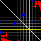 This matrix displays the maximum distance fluctuations between all pairs of CA atoms and between the two extreme conformations that were computed for this mode (DQMIN/DQMAX). Distance increases are plotted in blue and decreases in red for the strongest 10% of the residue pair distance changes. Every pixel corresponds to a single residue. Grey lines are drawn every 10 residues, yellow lines every 100 residues (counting from the upper left corner).