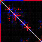 This matrix displays the maximum distance fluctuations between all pairs of CA atoms and between the two extreme conformations that were computed for this mode (DQMIN/DQMAX). Distance increases are plotted in blue and decreases in red for the strongest 10% of the residue pair distance changes. Every pixel corresponds to a single residue. Grey lines are drawn every 10 residues, yellow lines every 100 residues (counting from the upper left corner).