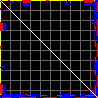 This matrix displays the maximum distance fluctuations between all pairs of CA atoms and between the two extreme conformations that were computed for this mode (DQMIN/DQMAX). Distance increases are plotted in blue and decreases in red for the strongest 10% of the residue pair distance changes. Every pixel corresponds to a single residue. Grey lines are drawn every 10 residues, yellow lines every 100 residues (counting from the upper left corner).