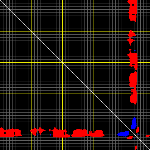 This matrix displays the maximum distance fluctuations between all pairs of CA atoms and between the two extreme conformations that were computed for this mode (DQMIN/DQMAX). Distance increases are plotted in blue and decreases in red for the strongest 10% of the residue pair distance changes. Every pixel corresponds to a single residue. Grey lines are drawn every 10 residues, yellow lines every 100 residues (counting from the upper left corner).