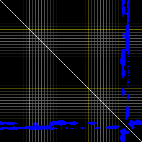 This matrix displays the maximum distance fluctuations between all pairs of CA atoms and between the two extreme conformations that were computed for this mode (DQMIN/DQMAX). Distance increases are plotted in blue and decreases in red for the strongest 10% of the residue pair distance changes. Every pixel corresponds to a single residue. Grey lines are drawn every 10 residues, yellow lines every 100 residues (counting from the upper left corner).