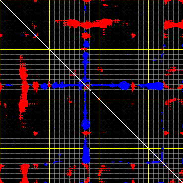 This matrix displays the maximum distance fluctuations between all pairs of CA atoms and between the two extreme conformations that were computed for this mode (DQMIN/DQMAX). Distance increases are plotted in blue and decreases in red for the strongest 10% of the residue pair distance changes. Every pixel corresponds to a single residue. Grey lines are drawn every 10 residues, yellow lines every 100 residues (counting from the upper left corner).