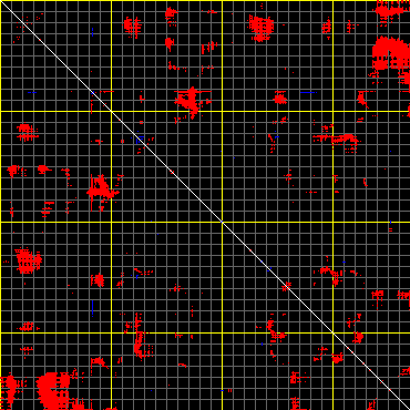 This matrix displays the maximum distance fluctuations between all pairs of CA atoms and between the two extreme conformations that were computed for this mode (DQMIN/DQMAX). Distance increases are plotted in blue and decreases in red for the strongest 10% of the residue pair distance changes. Every pixel corresponds to a single residue. Grey lines are drawn every 10 residues, yellow lines every 100 residues (counting from the upper left corner).