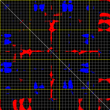 This matrix displays the maximum distance fluctuations between all pairs of CA atoms and between the two extreme conformations that were computed for this mode (DQMIN/DQMAX). Distance increases are plotted in blue and decreases in red for the strongest 10% of the residue pair distance changes. Every pixel corresponds to a single residue. Grey lines are drawn every 10 residues, yellow lines every 100 residues (counting from the upper left corner).