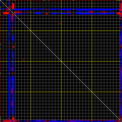 This matrix displays the maximum distance fluctuations between all pairs of CA atoms and between the two extreme conformations that were computed for this mode (DQMIN/DQMAX). Distance increases are plotted in blue and decreases in red for the strongest 10% of the residue pair distance changes. Every pixel corresponds to a single residue. Grey lines are drawn every 10 residues, yellow lines every 100 residues (counting from the upper left corner).