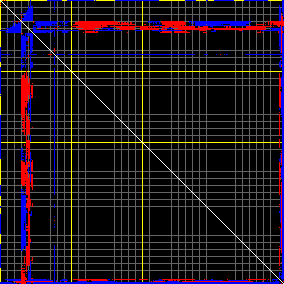 This matrix displays the maximum distance fluctuations between all pairs of CA atoms and between the two extreme conformations that were computed for this mode (DQMIN/DQMAX). Distance increases are plotted in blue and decreases in red for the strongest 10% of the residue pair distance changes. Every pixel corresponds to a single residue. Grey lines are drawn every 10 residues, yellow lines every 100 residues (counting from the upper left corner).