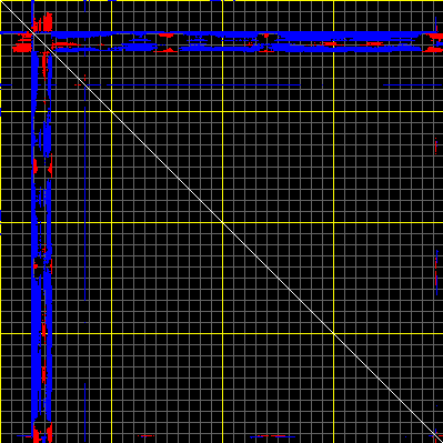 This matrix displays the maximum distance fluctuations between all pairs of CA atoms and between the two extreme conformations that were computed for this mode (DQMIN/DQMAX). Distance increases are plotted in blue and decreases in red for the strongest 10% of the residue pair distance changes. Every pixel corresponds to a single residue. Grey lines are drawn every 10 residues, yellow lines every 100 residues (counting from the upper left corner).