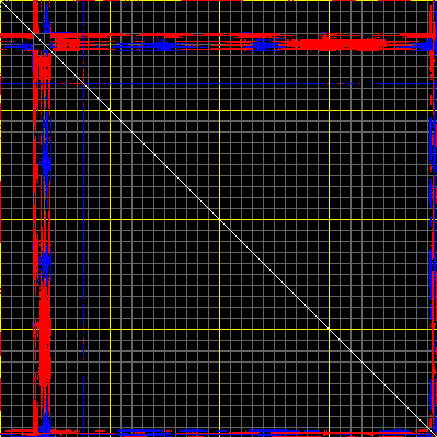This matrix displays the maximum distance fluctuations between all pairs of CA atoms and between the two extreme conformations that were computed for this mode (DQMIN/DQMAX). Distance increases are plotted in blue and decreases in red for the strongest 10% of the residue pair distance changes. Every pixel corresponds to a single residue. Grey lines are drawn every 10 residues, yellow lines every 100 residues (counting from the upper left corner).