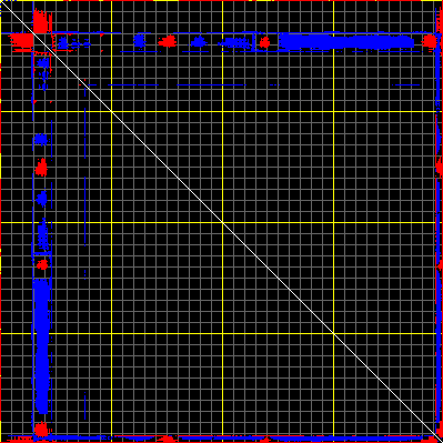This matrix displays the maximum distance fluctuations between all pairs of CA atoms and between the two extreme conformations that were computed for this mode (DQMIN/DQMAX). Distance increases are plotted in blue and decreases in red for the strongest 10% of the residue pair distance changes. Every pixel corresponds to a single residue. Grey lines are drawn every 10 residues, yellow lines every 100 residues (counting from the upper left corner).