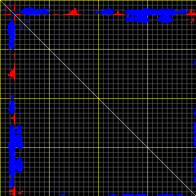 This matrix displays the maximum distance fluctuations between all pairs of CA atoms and between the two extreme conformations that were computed for this mode (DQMIN/DQMAX). Distance increases are plotted in blue and decreases in red for the strongest 10% of the residue pair distance changes. Every pixel corresponds to a single residue. Grey lines are drawn every 10 residues, yellow lines every 100 residues (counting from the upper left corner).