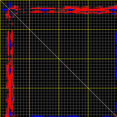 This matrix displays the maximum distance fluctuations between all pairs of CA atoms and between the two extreme conformations that were computed for this mode (DQMIN/DQMAX). Distance increases are plotted in blue and decreases in red for the strongest 10% of the residue pair distance changes. Every pixel corresponds to a single residue. Grey lines are drawn every 10 residues, yellow lines every 100 residues (counting from the upper left corner).