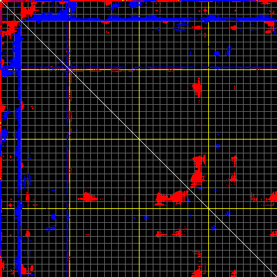 This matrix displays the maximum distance fluctuations between all pairs of CA atoms and between the two extreme conformations that were computed for this mode (DQMIN/DQMAX). Distance increases are plotted in blue and decreases in red for the strongest 10% of the residue pair distance changes. Every pixel corresponds to a single residue. Grey lines are drawn every 10 residues, yellow lines every 100 residues (counting from the upper left corner).