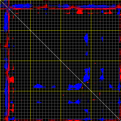 This matrix displays the maximum distance fluctuations between all pairs of CA atoms and between the two extreme conformations that were computed for this mode (DQMIN/DQMAX). Distance increases are plotted in blue and decreases in red for the strongest 10% of the residue pair distance changes. Every pixel corresponds to a single residue. Grey lines are drawn every 10 residues, yellow lines every 100 residues (counting from the upper left corner).